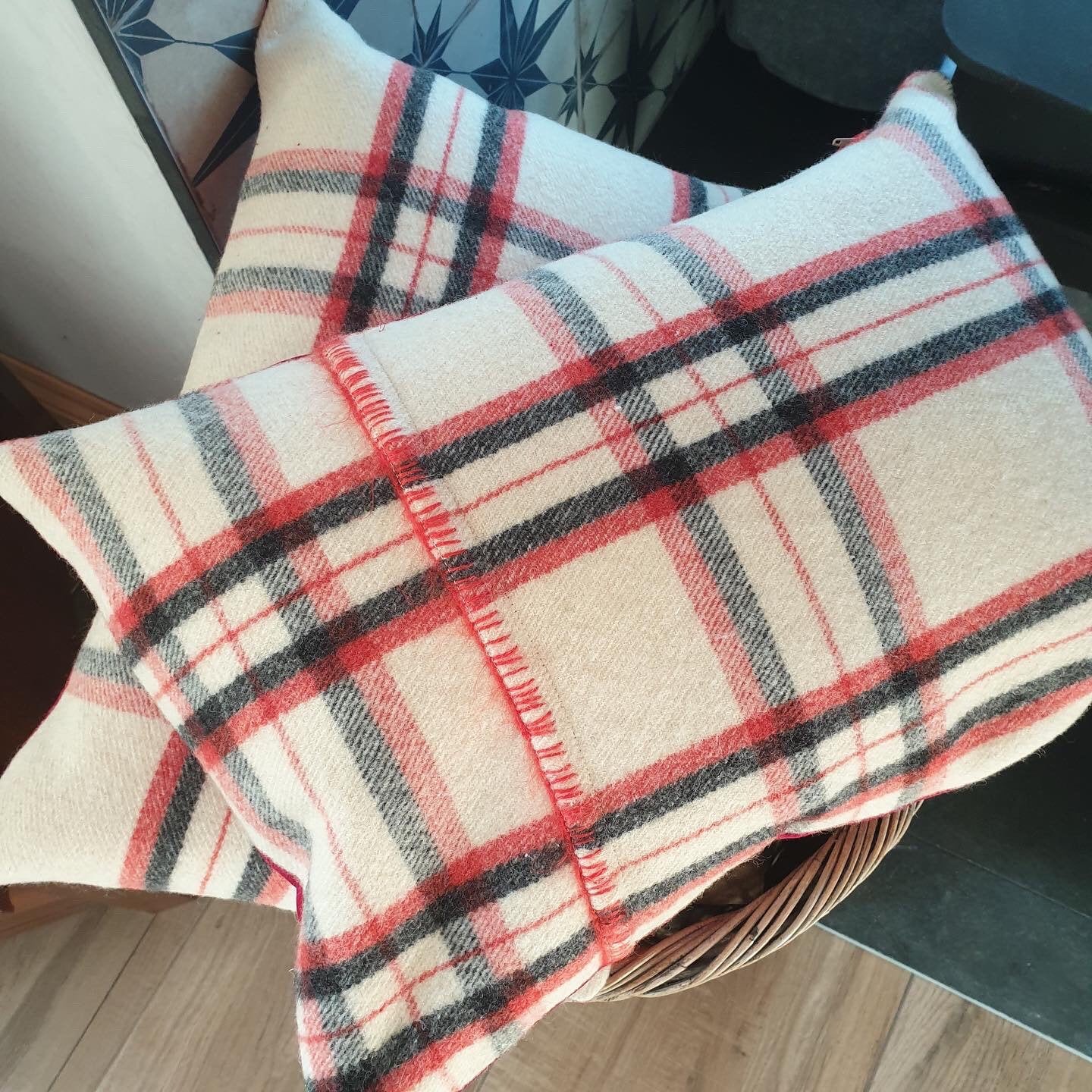 Feather cushion made from a vintage welsh wool blanket in a traditional cream, red and black check design and backed with a contemporary red velvet